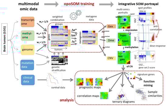 For single-omics analysis, we developed a data “portrayal” method based on machine learning using self-organizing maps (SOM) [18,19,20]. The method visualizes the molecular data landscapes in terms of “individual” maps and enables their evaluation by visual inspection as well as by extensive bioinformatics downstream analysis. The method is available as R-program [19] and as an interactive web tool for processed data [21]. Thus far, we applied SOM portrayal in the gene expression and/or the methylation domains to different cancer entities such as gliomas [22,23,24,25], B-cell lymphomas [26,27,28], colon cancer [29,30], and melanomas [31]. A first step towards an integrative analysis was the mapping of multiple data types using SOM portrayal of histone modifications in the epi-genomes of stem and progenitor cells [32]. Another group presented a SOM framework to conduct integration of large-scale cancer genomics data [33]. For deciphering the interplay between co-expressed and co-methylated genes in high grade gliomas, we recently developed a novel combiSOM portrayal approach which directly combines gene expression and methylation data in a joint machine learning step, and which finally enables the joint cartography of both omics modalities [34].