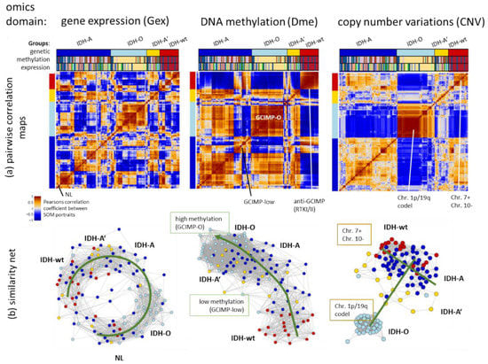 Next, we processed integral combiSOM portrayal using gene expression (Gex), methylation (Dme), and CNV data as described in the Methods section. It generated one combiSOM per tumour with one image for each of the three omics realms (Appendix B, Figure A1). Pairwise correlation heatmaps between these portraits characterize the co-variance landscapes of the three omics data (Figure 3a). The maroon-coloured squares along the diagonals mark clusters of tumours with correlated molecular portraits in each of the heatmaps. They mostly agree with the genetic groups, thus reflecting their associations with the Gex, Dme and CNV landscapes. Substructures within the correlation clusters of the genetic groups are indicative of a fine structure of tumour heterogeneity previously resolved in terms of eight expression (E1–E8) and six methylation (M1–M6) glioma subtypes [25,35]. For example, subtypes E7–E8 and M6 can be related to neuronal (NL)-tumours which distribute over all genetic groups but show distinct features differing from other IDH-wt, IDH-A and IDH-O LGG due to their low tumour cell content. Subtypes M2 and E3 induce other sub-patterns in the genetic IDH-A group because of their decreased methylation level forming a separate GCIMP-low methylator type [35]. The Dme heatmap reveals another GCIMP-O methylator type of IDH-O tumours differing from the GCIMP patterns of IDH-A gliomas [35]. The detailed portraits of the E- and M-subtypes in the combiSOM are discussed below.