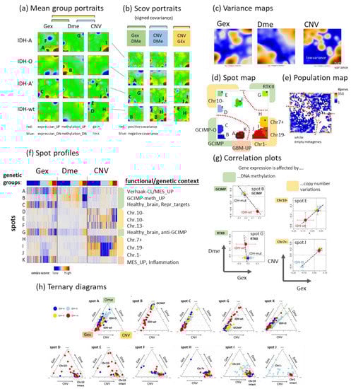 SOM portrayal of the gene expression (Gex), DNA methylation (Dme), and CNV landscapes. (a) Mean portraits of the genetic groups indicate characteristic features as red (increased values) or blue (decreased values) spots which are labelled by capital letters. The full gallery of individual portraits is shown in Figure A1. (b) ScoV portraits show cross-correlations between pairwise combinations of omics features. Gex and Dme predominantly anti-correlate (blue spots) reflecting repressive effect of DNA promoter methylation on gene activity while CNV and Gex/Dme mostly positively correlate (red) reflecting dose–response relationships. (c) Variance maps colour code the gene space for high (maroon colour) to low (blue) variance of the respective omics score. The variance patterns of Dme and CNV distribute along the two perpendicular diagonals, thus reflecting partial independence while the Gex pattern mixes with them. (d) The spot map shows the areas of the map with high feature values in any of the group portraits. They are observed predominantly in the Gex (red colour along the frame), Dme (green) or CNV (yellow) domains and are labelled by capital letters A–K in a clockwise direction. (e) The population map visualizes the population of metagenes with single genes. In the Dme- and Gex dominated regions (lower left to upper right diagonal), genes are more smoothly distributed while the CNV domain is characterized by an “isolated island”-like distribution of genes. (f) Spot profiles in the three omics domains and their functional/genetic context indicate increased (red) and decreased (blue) feature scores. Details are provided in Table A1 (Appendix B) and Supplementary Table S1. (g) Correlation plots of genes from selected spots reveal negatively correlated repressive relations between Dme and Gex and positively correlated dose–response relations between CNV and Gex. (h) Ternary diagrams of the feature composition in each spot and tumour. Point clouds along the left Gex axis are driven by changing methylation (upper row of diagrams) while the lower row refers to spots governed mostly by CNV Gex dose responses.