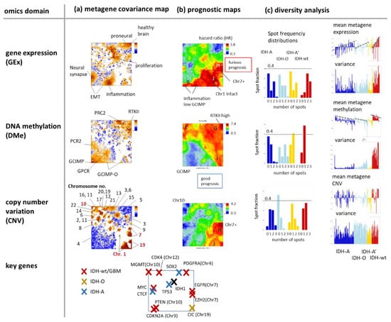 Characteristics of the omics domains: (a) The metagene covariance maps colour code the mean covariance between the single-gene profiles and the metagene profiles in each pixel. High covariance values (red) agree with the spot regions. They preferentially associate with cellular programs (Gex), methylation modes (Dme), and chromosome-wise aberrations (CNV). (b) The prognostic map colour codes the overall survival (OS) hazard ratio (HR, compared with the mean OS averaged over the whole data set) between maximum (red, furious prognosis) and minimum (blue, good prognosis) HR. HR values are calculated metagene-wise by selecting tumours showing omics scores exceeding one standard deviation in positive direction (i.e., with high values of the score, see [35] for details). (c) Diversity analysis includes spot frequency distributions and profiles of the mean omics score and variance per tumour. The row below maps the key genes driving the different genetic subtypes (see Discussion section).