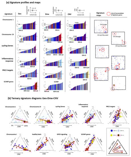 For further knowledge mining in the combined data, we selected gene sets from different categories such as gene ontology biological process (GO BP), signature genes from previous omics studies (mostly Gex), as well as genes located at a certain chromosome. We plotted their ranked profiles, locations of the genes in the SOM as signature maps as well as ternary diagrams in Gex-Dme-CNV space (Figure 6a and Figure A2 for a larger overview). For example, genes from Chr. 1 show low expression in IDH-O tumours due to the loss of copy numbers of Chr. 1, which is associated with slightly decreased methylation levels. These Chr. 1 genes accumulate in and near spot J referring to samples with codeletion together with Chr. 19, but also in a second area which refers to single deletions at Chr. 1 (see red circles in Figure 6a, first raw). Genes from Chr. 19 accumulate in other areas of the map, first of all, in spot I due to frequent codeletion together with Chr.1 in IDH-O as well as in a second spot for LGG with single deletions. CNV dominated alterations of LGG spread roughly along the CNV axis of the ternary diagrams (Figure 6b). GCIMP genes and PRC2-targets accumulate along the Gex axis, which is indicative for Dme-driven expression changes. The distributions of gene signatures related to inflammatory response and of GPCR encoding genes are similar and reflect a strong effect of methylation with subtle differences between IDH-O and IDH-A tumours (see for details [25,35]). Contrarily, cycling genes accumulate around spot F in the map. They form a cloud distributing along the bisectrix between the Gex and CNV axes in the ternary diagram, which indicates small effects of Dme and CNV on Gex, which, in turn, is more governed by transcription factor (TF) network, e.g., via Myc-targets distributing similarly as cycling genes (Figure 6 and Figure A2b). Importantly, most functional signatures show rather continuous distributions despite the systematic differences between the subtypes. In summary, profiling and mapping of gene signatures provide combined information about the mutual effect of gene expression, methylation, and copy number variation on functional modes enabling to evaluate their impact on tumour heterogeneity.