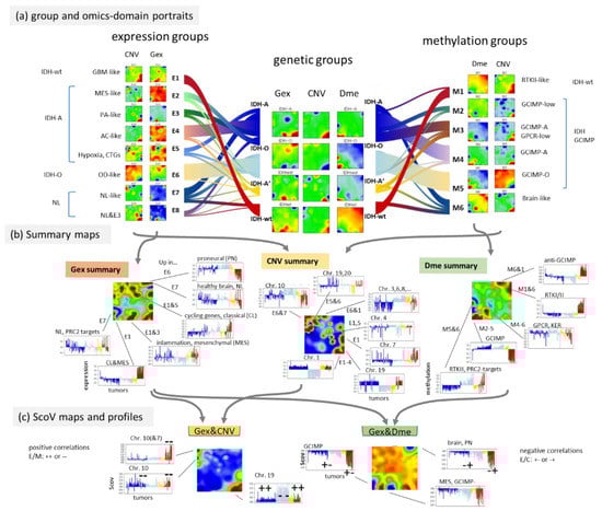 Profiles of the most pronounced spots illustrate the variations of Gex, Dme and CNV features across the LGG groups and subtypes, e.g., antagonistic overexpression and hypermethylation of IDH-wt which allocates the affected genes in opposite corners (lower left versus upper right) of the map (Figure 7b). This anti-correlation becomes even better resolved in the respective ScoV map (Figure 7c) revealing, e.g., hypermethylation modes in IDH-mut (GCIMP) and IDH-wt (proneural, PN) tumours by blue spots (see [24]). The Gex versus CNV ScoV-profiles indicate direct correlations (red spots) between gene expression and CNV in IDH-wt (E1, M1) in the left upper corner mainly due to Chr10- losses as well as in IDH-O (E6, M5) in the right lower corner due to Chr1/19 codeletions. Comparison of the Gex versus Dme ScoV-profiles, in turn, indicate negative correlations (blue spots) which refer to GCIMP and anti-GCIMP methylation modes (Figure 7c). In summary, resolution of the genetic groups into expression and methylation subtypes further refines the combined omics landscapes, especially of IDH-mut astrocytomas, IDH-A/A’, in terms of functional modes such as alterations of the cell cycle activity and inflammatory response governed by combined changes of methylation and/or CNV modalities. Combined portrayal resolves these coupled modes with high granularity and visualizes them in an intuitive fashion.