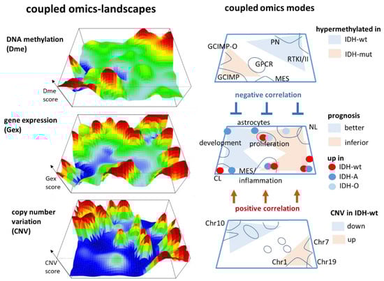 Our multi-omics cartography visualizes three layers of molecular landscapes which are linked by gene-centred Dme (promoter methylation), Gex (gene expression), and CNV (copy number variation) features (Figure 8). Our method segments the different omics landscapes into modules of co-methylated, co-expressed, and co-aberrant genes which are visualized as peaks in the three dimensional and as spots in the two-dimensional maps, respectively. They reflect the underlying network of regulatory modes of cell activity within each of the omics layers and between them. For example, GCIMP-methylation due to the IDH mutation generates such peaks in the left lower and right upper part of the map which hypermethylate in tumours carrying either the mutated or the intact IDH gene, respectively. Conversely, key CNV associating with IDH-wt and IDH-O tumours more distribute along the other diagonal from the left upper towards the right lower part of the map. This virtually orthogonal distribution of DNA methylation and genetic CNV effects reflects their partial independence. In contrast, variant transcriptome modules spread throughout the whole map because gene expression is modulated by methylation as well as by CNVs preferentially via repressive and direct interactions, respectively. Certain modules such as the G-protein coupled receptor (GPCR) that peak strongly protrude only in the methylation map, thus illustrating that variations in one of the omes does not necessarily transform into variations in another omics layer (see, e.g., [35] for a detailed discussion). The different modes associate with different functional contexts (Figure 4) and prognoses, which can be visualized in terms of functional and hazard ratio maps, respectively (Figure 5a,b) and which reflect aspects of pathogenesis of LGG.