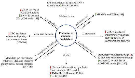 Many diseases, including cancer, are associated with a perturbation of the microbiome [177,178]. This is commonly termed dysbiosis and represents an imbalance between the healthy gut microbiota and pathobionts that promote disease. Probiotics help restore a healthy balance and have been used to prevent and treat disease [179]. Although oral probiotics work in part by out-competing pathobionts, efficacy more likely involves immune modulation, including effects on macrophage function (Figure 1) [180]. The administration of probiotic lactic acid bacteria (e.g., Lactobacillus and Bifidobacterium) have been shown to reduce CRC incidence, tumor multiplicity, and tumor volume in pre-clinical models [181,182,183,184,185,186]. Probiotics may also protect against cancer initiation by restoring epithelial barrier integrity [187]; reducing cellular proliferation, repressing COX-2, and increasing IFNγ and IL-10 [188,189]; decreasing proinflammatory cytokines (e.g., TNF-α, IL-1β, IL-22, and IL-6) [181,190]; and increasing caspase 7, caspase 9, and Bcl-2-interacting killer protein [190]. These effects can collectively produce potent cancer prevention responses. The role of immunomodulation versus gut colonization by probiotics was addressed using dead L. plantarum in an AOM/DSS model. Dead bacteria reduced inflammatory markers, induced apoptosis, initiated cell cycle arrest, increased IgA levels, and prevented CRC [191]. These findings suggest that oral bacterial antigens, and not necessarily colonization with live bacteria, can be sufficient for cancer prevention. However, the complex interactions among host, microbiome, and probiotics are not always so clear-cut. In an aggressive model of CRC that used AOM to initiate CRC in Il10 knockout mice, a mixture of probiotics not only altered microbial community composition but also paradoxically enhanced tumor multiplicity [192].