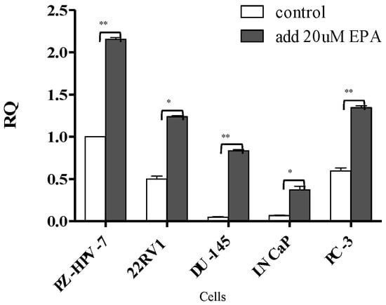 Figure 2. Comparison of the miR-378 expression levels before and after EPA treatment in each cell, measured by quantitative real-time polymerase chain reaction (qRT-PCR). EPA untreated (white bar) and EPA treated (black bar). Y-axis risk quotient (RQ) = tumor cells/reference sample. The PZ-HPV-7 cell was used as a reference sample, and its quality was normalized to 1, then further compared with other treated or untreated EPA cells. The data presented in the figure are the mean ± standard deviation. * represents p < 0.05, ** represents p < 0.005.