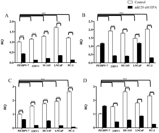 Figure 3. Comparison of the relative expression of KLK gene expression in each cell before and after treatment with EPA, measured by qRT-PCR. White bars represent original cells and black bars represent cells after treatment with 20 µM of EPA. Y-axis risk quotient (RQ) = tumor cells/reference sample. The PZ-HPV-7 cell was used as a reference sample, and its number quality was normalized to 1, then further compared with other cells. All the cells were also compared to their original cells. (A) KLK2 gene expression, (B) KLK4 gene expression, (C) KLK6 gene expression, and (D) KLK14 gene expression. The data presented in the figure are the mean ± standard deviation. *** represents p < 0.001.