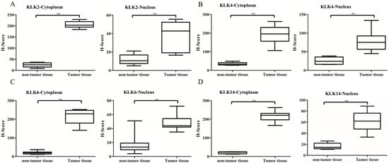 Figure 5. Significant KLK protein expression exhibited in PCa tissues either in the cytoplasm or nucleus. Box diagram of protein expression in surrounding normal tissues and tumor tissues. (A) KLK2; (B) KLK4; (C) KLK6; (D) KLK14. The data in the figure are the mean ± standard deviation. ** represents p < 0.001.