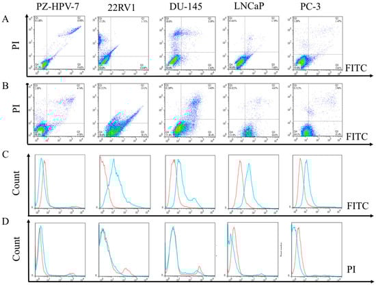Figure 6. Flow cytometric analysis indicating that most of the tumor cells progressed towards apoptosis. (A) Original cells. (B) Cells after treatment with 20 µM of EPA. (C) The intensity of fluorescein isothiocyanate (FITC) labelled on cells shows the degree of cell apoptosis; red curves represent the original cells and blue curves represent cells after treatment with EPA—this is also shown on the right-hand side of the four-quadrant axes in (A,B). (D) The intensity of propidium iodide (PI) shows the degree of cell necrosis; red curves represent the original cells and blue curves represent cells after treatment with EPA—this is also shown on the upper side of the four-quadrant axes in A and B. Cells located in Q1 or Q2 zones tended towards necrosis; cells in the bottom right of the four-quadrant axis (Q3 zone) tended towards early apoptosis; cells in the Q4 zone were healthy.