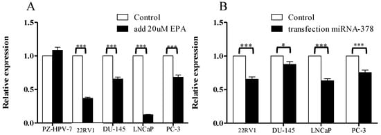 3.1. Comparison of miR-378 Expression between PCa Cells and Normal Prostate Cells before and after EPA Treatment