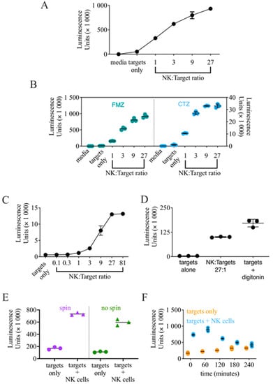 Optimization of a luciferase release-based cytotoxicity assay for a high-throughput screen. NK92 cells were co-cultured with K562-NL cells at the indicated E:T ratios for 5-h at 37 °C. After incubation, the supernatant was collected, the indicated substrate added, and luminescence read by Biotek Synergy (Winooski, WI, USA) microplate reader. (A) Luciferase-release cytotoxicity assay using transduced K562-NL cells (bulk population, unsorted). Twenty thousand K562-NL targets per well. After the incubation, luciferase activity was measured using FMZ (Promega Nano-glo, Madison, WI, USA) luciferase assay system. Mean +/− SD of three technical replicates. (B) After the incubation, luciferase activity was measured after addition of either FMZ luciferase assay system or CTZ substrate. Ten thousand K562-NL targets per well. Mean +/− SD of three technical replicates. Representative of 3 biological replicates. (C) Luciferase-release cytotoxicity assay using 10,000 K562-NL cells. After the incubation, luciferase activity was tested after addition of CTZ. Mean +/− SD of three technical replicates. Graph is representative of 2 biological replicates. (D) K562-NL cells were treated with 30 μg/mL digitonin and compared to K562-NL cells co-cultured at an E:T ratio of 27. Ten thousand K562-NL cells per well. Luciferase activity was tested after addition of CTZ. Mean +/− SD of three technical replicates. Representative of 2 biological replicates. (E) Supernatant from a cytotoxicity assay was either collected directly or collected after a centrifugation step. Three technical replicates are shown. Representative of 2 biological replicates. (F) NK92 or K562-NL cells were incubated at room temperature at indicated times (minutes) prior to start of a cytotoxicity assay. Mean +/− SD of three technical replicates. Representative of 3 biological replicates.