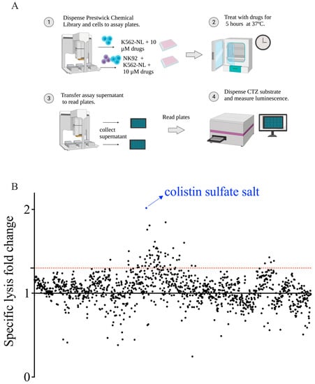 Seminal studies from the 1990s and early 2000s highlighted the importance of the immune system in tumor biology through processes such as immunosurveillance and immunoediting [1], which in turn led to the most recent advances in cancer therapeutics: immunotherapies. Cancer immunotherapy is an encompassing term referring to therapeutic strategies that target components of the immune system to enhance clearance of the malignant cells. Various categories of immunotherapies exist [2] and, encouragingly, some became first-line treatments in some cancer types [3,4]. As the field of immunotherapy continues to develop, we have gained a better understanding of how immune cells contribute to immunotherapy efficacy, for instance, Natural Killer (NK) cells. NK cells are innate lymphoid cells that play a crucial role in tumor surveillance and clearance [5]. The importance of NK cells in immunosurveillance is appreciated from the observation that mice without functional NK cells show impaired tumor control [6,7] and that patients with defective or a decreased frequency of NK cells are at greater risk of developing malignancies, specifically virally induced cancers [8,9]. Recently, a thorough systematic review and meta-analysis encompassing 15 solid cancer types found that NK cell infiltration in solid tumors was associated with improved overall survival [10], whereas a lower low frequency of circulating or tumor-infiltrating NK cells or NK cells that display an impaired function are associated with a worse prognosis in several cancer types [11,12,13,14]. NK cells can either be administered for adoptive cell therapy or can be directly targeted to enhance their anti-tumor activity [5]. Within the second category, small molecule drugs have been surprisingly overlooked, despite evidence that small molecules can potentiate NK anti-cancer functions [15,16]. In addition to enhancing cytotoxicity, small molecules can also be used to promote proliferation and maturation in expansion protocols for NK cells that are used for adoptive cell therapies [15]. Small molecule immunotherapies are advantageous as they are orally bioavailable, usually cost less than biological immunotherapies, can target both extracellular and intracellular components, and have a greater ability to penetrate through physiological barriers [17]. However, from small molecule identification to development of a lead drug compound, the clinical drug pipeline can take years if not decades before the drug sees use in the clinic. For this reason, drug repurposing is an attractive alternative that identifies new indications for previously approved drugs. Repurposed drugs already have a safety and efficacy profile associated with them which makes this a favorable route. Several studies have conducted high-throughput drug screenings to identify drugs that modulate NK cell activity. These studies utilized commercially available libraries containing repurposed drugs [18,19,20] or natural compound libraries [21,22] and have identified small molecules that were not previously known to modulate NK cell activity. Here, we screened the Prestwick Chemical Library for compounds capable of enhancing the cytotoxicity of human NK cells towards leukemia target cells and identified the antibiotic colistin sulfate as an enhancer of NK cell cytotoxicity.