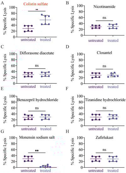 Colistin sulfate salt increases NK92 cytotoxicity against K562-NL. NK92 and K562-NL cells were seeded at an E:T ratio of 1 into 96-well V bottom plates containing either identified drug hits (10 μM) or DMSO for 5-h at 37 °C. Each drug tested had an independent untreated control. After incubation, the supernatant was subjected to a luciferase release assay. (A) Colistin sulfate salt. (B) Nicotinamide. (C) Diflorasone diacetate. (D) Closantel. (E) Benazepril hydrochloride. (F) Tizanidine hydrochloride. (G) Monensin sodium salt. (H) Zafirlukast. Each dot represents a technical replicate, experiments were repeated twice. Two-tailed Mann–Whitney test. ns = not significant, **: p < 0.01.
