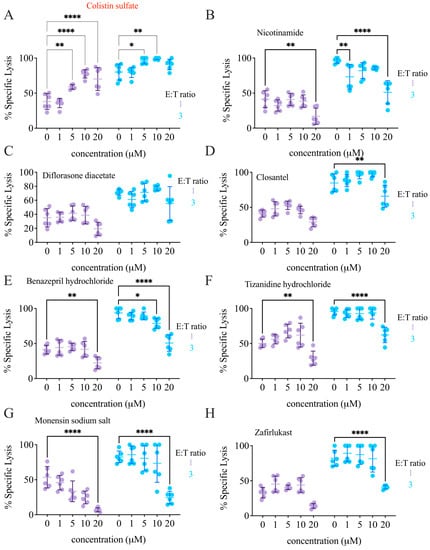 Colistin sulfate salt increases NK92 cytotoxicity against K562-NL. NK92 and K562-NL cells were seeded into a 96-well V bottom plate at a 1:1 or 3:1 E:T ratio with 10,000 K562-NL cells per well and treated with 1, 5, 10, and 20 μM of the indicated drug for 5-h at 37 °C. After incubation, the supernatant was subjected to a luciferase release assay. (A) Colistin sulfate salt. (B) Nicotinamide. (C) Diflorasone diacetate. (D) Closantel. (E) Benazepril hydrochloride. (F) Tizanidine hydrochloride. (G) Monensin sodium salt. (H) Zafirlukast. Each dot represents a technical replicate, experiments were repeated twice. Two-way ANOVA with Tukey’s multiple comparison test. *: p < 0.05, **: p < 0.01, ****: p < 0.0001.