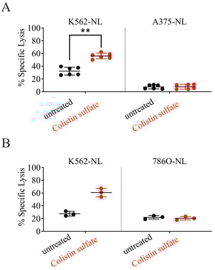 Treatment with Colistin sulfate failed to increase NK92-mediated killing of non-hematopoietic cell lines. NK92 and K562-NL/A375-NL (A) or K562-NL/786O-NL (B) cells were seeded into a 96-well V bottom plate at a 1:1 E:T ratio with 10,000 target cells per well and treated with 10 μM of colistin for 5-h at 37 °C. After incubation, the supernatant was collected and transferred to a 96-well black plate. The Biotek Synergy microplate reader (Winooski, WI, USA) was used to dispense CTZ and read luminescence. Percent specific lysis is depicted. Each dot represents a technical replicate, experiments were repeated twice. Two-tailed Mann–Whitney test. **: p < 0.01.