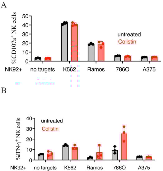 Treatment with Colistin sulfate increased IFN-γ production of NK92 stimulated with 786O cells. NK92 cells were stimulated at a 1:1 ratio with K562, Ramos, 786O, or A375 cells in the presence or absence of 10 μM of colistin for 5-h at 37 °C. After incubation, NK cells were stained for CD107a externalization (A) and IFN-γ production (B). Technical replicates of one experiment, representative of three performed, are shown.