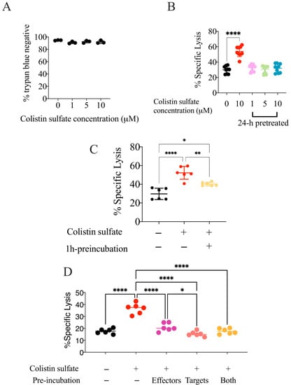 The effect of colistin sulfate on NK cells is short lived. (A) Percent viability of NK92 cells by trypan-exclusion dye after 24-h treatment with 0, 1, 5, and 10 μM of colistin. (B) NK92 cells were treated for 24-h with 0, 1, 5, and 10 μM of colistin. After 24-h, NK92 cells were washed and co-cultured with 10,000 K562-NL cells at a 1:1 E:T ratio for 5-h at 37 °C. NK92 cells co-cultured with targets cells and treated with 10 μM of colistin during the 5-h incubation were also included. After incubation, the supernatant was subjected to a luciferase release assay. The Biotek Synergy microplate reader (Winooski, WI, USA) was used to dispense CTZ and read luminescence. Percent specific lysis is depicted. Each dot represents a technical replicate, experiments were repeated three times. One-way ANOVA with Dunnett’s multiple comparison test. ****: p < 0.0001. (C) NK92 cells were treated for 1-h with 10 μM of colistin. After 1-h, the compound was washed and NK92 cells were co-cultured with 10,000 K562-NL cells in a 96-well V bottom plate at a 1:1 E:T ratio for 5-h at 37 °C. NK92 cells co-cultured with targets cells and treated with 10 μM of colistin during the 5-h incubation were also included. Percent specific lysis is depicted. Each dot represents a technical replicate, experiments were repeated twice. One-way ANOVA with Tukey’s multiple comparison test. ns = not significant, *: p < 0.05, **: p < 0.01; ****: p < 0.0001. (D) NK92 and K562-NL cells were pre-treated separately with 10 μM of colistin. After 1-h, cells were washed and co-cultured with either treated or untreated cells. Cells were seeded in a 96-well V bottom plate at an E:T of 1 ratio, using 10,000 K562-NL cells per well for 5-h at 37 °C. NK92 cells co-cultured with targets cells and treated with 10 μM of colistin during the 5-h incubation were also included. Percent specific lysis is depicted. Each dot represents a technical replicate, experiments were repeated twice. One-way ANOVA with Tukey’s multiple comparison test. Only significant differences between treatments are shown. *: p < 0.05; ****: p < 0.0001.