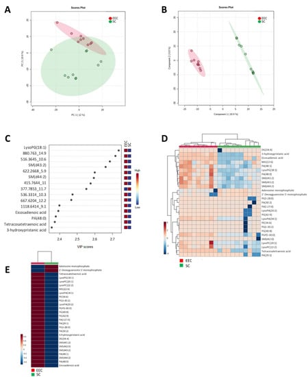 Following multivariate statistics, we focused on defining the specific metabolites that are statistically different from one group to the other (Student t-test, p < 0.05). We found 232 metabolites, 54 of them with a corrected p-value (FDR) < 0.05 (Suplementary File S1). Among the 232, 93 (40%) were identified as belonging to different families based on exact mass, retention time, isotopic distribution and/or MS/MS spectrum (Table 3). In particular, we found 3 (3.2%) benzene and substituted derivative metabolites, 5 (5.43%) carboxylic acids and derivatives, 7 (7.5%) fatty acyls (4 fatty acids and conjugates, 1 eicosanoid, 1 lineolic acid and derivative and 1 fatty acid ester), 15 (16.1%) glycerolipids (6 monoradylglycerols and 9 diradylglycerols), 46 (49.4%) glycerophospholipids (19 glycerophosphates, 10 glycerophosphoglycerols, 1 glycerophosphoinositol, 6 glycerophosphocholines, 6 glycerophosphoethanolamines, 2 glycerophosphoserines, 1 glycerophosphoinositolphosphate and 1 CDP-glycerol), 1 (1%) organoxigen compound, 2 (2%) prenol lipids, 1 (1%) purine nucleotide, 10 (10.7%) sphingolipids (all of them sphingomyelins) and 3 (3.2%) steroid and steroid derivatives. Notably, mostly lipid species (96.4%) showed lower levels in SC compared to EEC, while those metabolites that belonged to amino acids and purine nucleotides showed higher levels in SC. The regulation (low or high levels) for all the differential metabolites is shown in the Supplementary File S1.