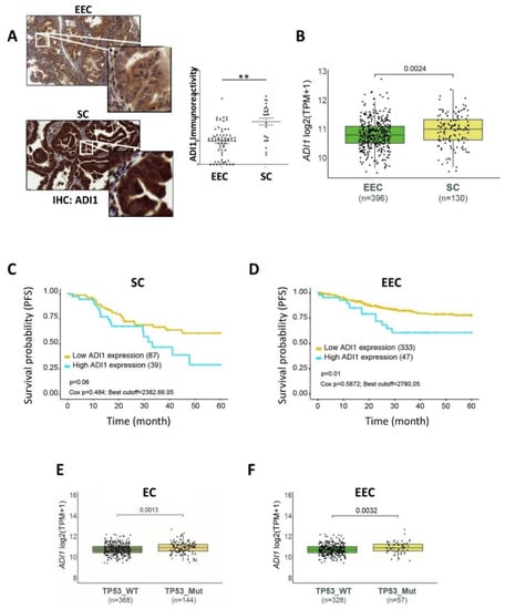 ADI1 expression and progression-free survival (PFS) of endometrial cancer patients. (A) Immunohistochemistry (IHC) analysis of ADI1 expression levels in EEC and SC samples. (Left) Representative images. Magnification 20× and 100×. (Right) Quantification graph. Graph value is the mean, and error bars are represented as mean ± S.E.M. Statistical analysis was performed using two-tailed paired Student t-test analysis. ** p < 0.01. (B) ADI1 mRNA expression levels in EEC and SC patients. (C) Kaplan–Meier plots of PFS of SC patients, stratified into ADI1 high-expression and low-expression groups. (D) Kaplan–Meier plots of PFS of EEC patients, stratified into ADI1 high-expression and low-expression groups. (E) ADI1 mRNA levels of EC patients stratified according to TP53 mutation status. (F) ADI1 mRNA levels of EEC samples stratified according to TP53 mutation status. Gene expression data, gene mutational data and their related clinical information were obtained from TCGA-UCEC public database [20].