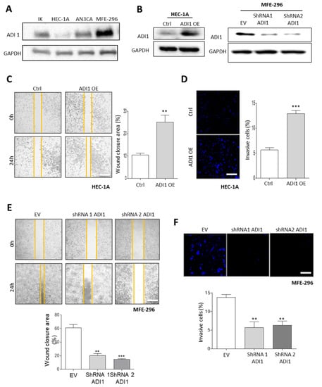 In an attempt to investigate the role of ADI1 in the acquisition of an aggressive phenotype in EEC, we performed a western blot assay to assess the levels of ADI1 in four EEC cell lines (Figure 3A). The results obtained showed that differentiated EC cell lines express moderately low levels of ADI1, whereas the dedifferentiated MFE-296 cell lines express high ADI1 protein levels.