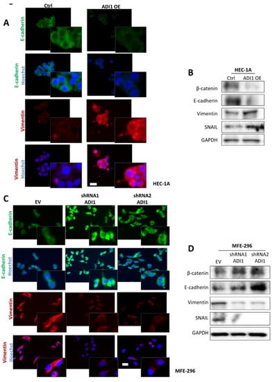 It is well known that epithelial–mesenchymal transition (EMT) changes are central processes in the migration and invasion phenomena of endometrial neoplastic cells [31]. Therefore, on the basis of the evidence observed, we next assessed the expression of several epithelial and mesenchymal markers on the ADI1 modulated-expression cell lines by immunofluorescence and western blot assays. Thus, the results obtained show that in the HEC-1A cell line over-expressing ADI1 presented a down-expression of epithelial protein markers such as E-cadherin and β-catenin and an up-regulation of the mesenchymal protein marker vimentin and the EMT transcriptional factor Snail (Figure 4A,B). On the other hand, ADI1 knockdown MFE-296 cells presented a raised expression of E-cadherin and β-catenin epithelial markers and down-regulated protein levels of vimetin and Snail (Figure 4C,D).