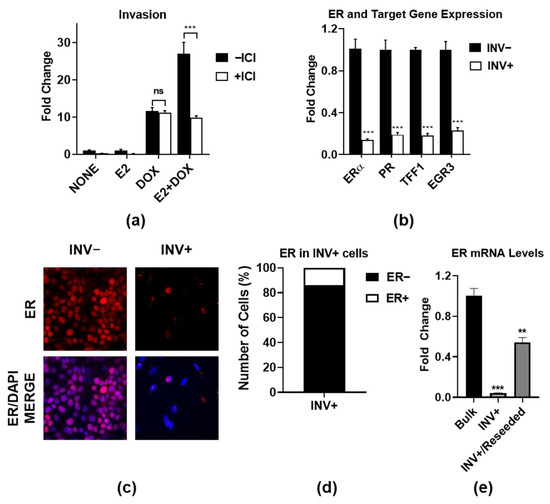 To confirm the role of ER in promoting invasion upon the constitutive activation of IKKβ (CA-IKKβ), we treated MCF-7 expressing a doxycycline (DOX)-inducible CA-IKKβ with estradiol (E2) and/or DOX, and then assessed invasion in the presence or absence of the ER antagonist, ICI 182,780 (ICI). ICI significantly reduced the invasion of E2 + DOX-treated cells, but not DOX-treated cells, suggesting that ER plays an active role in promoting invasion beyond the function of IKKβ (Figure 1a). To examine the ER expression and activity in invasive cells, we compared invaded cells (INV+) (i.e., those that have moved through the transwell insert) and noninvaded cells (INV−) (i.e., those that remain on the top of the transwell insert) following E2 + DOX treatment. We found that the expression of ER and its classical target genes, progesterone receptor (PR), trefoil factor 1 (TFF1), and early growth response protein 3 (EGR3), were all reduced in invaded cells vs. noninvaded cells (Figure 1b). An immunofluorescence analysis showed that ER expression was confined to a small percentage of invaded cells, whereas ER expression was detected in all noninvaded cells (Figure 1c,d). The reduced level of ER expression in invasive cells appears to be transient since the ER expression levels recovered after the invasive cells were reseeded in standard culture conditions and were allowed to recover (Figure 1e). These findings suggest that, despite a high degree of heterogeneity in the ER expression and reduced activity on classical target genes, ER is actively involved in promoting IKKβ-driven invasion.