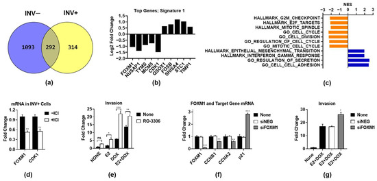 ER regulates a unique gene signature in invasive cells. RNA was isolated from INV+ and INV− cells as described in Figure 1, and RNA-seq was performed. (a) Genes regulated by ICI in INV− and INV+ cells were identified using a cutoff of FDR < 0.001 and log2 fold change (FC) of 0.5. Overlap of these gene lists in INV+ and INV− cells identified a 314-gene signature (Signature 1) specific to INV+ cells. (b) Log2 fold change expression is shown for the top up- and downregulated genes on the basis of FDR by ICI in INV+ cells only. (c) GSEA analysis of Signature 1 genes showing top significantly (p < 0.05) enriched Hallmark and GO_biological pathways and normalized enrichment scores from MsigDB v. 7.2. (d) FOXM1 and CDK1 mRNA was assessed by QPCR in E2 + DOX-treated INV+ cells treated with or without ICI. (e) MCF-7-CA-IKKβ cells were treated with E2 +/− DOX for 72 h, followed by the CDK1 inhibitor (CDKi) RO-3306 (5 µM) for a further 16 h, and invasion was assessed. (f,g) MCF-7-CA-IKKβ cells were transfected with an siRNA to FOXM1, or a scrambled negative control siRNA (siNEG), and then treated with E2 + DOX for 72 h. (f) QPCR for FOXM1 and FOXM1 target genes was performed, and (g) invasion was assessed. * p < 0.05; ** p < 0.01; *** p < 0.001; ns: not significant.