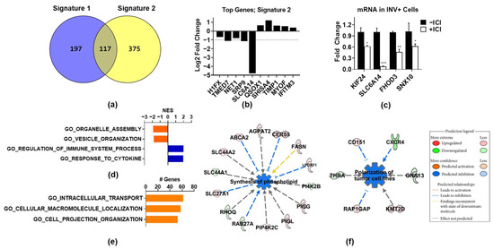 Since Signature 1 is heavily dominated by proliferation-associated genes, which do not explain how ER promotes invasion, we repeated the bioinformatics analysis after removing these genes and applying a less stringent cutoff (0.25 log2 fold change and FDR < 0.01). This generated a 492-gene signature (Supplemental Table S3), named Signature 2, which contained 375 distinct genes and 117 genes overlapping with Signature 1 (Figure 3a). Since the gene set enrichment analysis gives a probability that a gene signature is enriched for a certain process but does not mean that all genes in the signature are involved in that process, we decided to include the overlapping genes not related to proliferation in Signature 2, since they may function to promote invasion. Some of the top regulated genes on the basis of FDR are shown in Figure 3b, several of which were validated by QPCR as ICI-regulated in invasive cells (Figure 3d). The GSEA analysis of Signature 2 (Supplemental Table S4) revealed that genes upregulated by ICI were related to the regulation of cytokines and immune processes (Figure 3d), which may reflect the ability of ER to suppress the NFκB pathway on classical target genes [28,29]. The genes downregulated by ICI, in contrast, were significantly associated with organelle and vesicle assembly and organization (Figure 3c). Additionally, numerous genes found in Signature 2 were related to essential biological processes, such as intracellular transport, macromolecular localization, and cell projection organization, although these signatures did not achieve significance (Figure 3e). A further interrogation of the Signature 2 genes using IPA software revealed the synthesis of phospholipids and the polarization of tumor cells as significantly downregulated by ICI (Figure 3f). While each of these ICI-regulated pathways and cellular processes can be important for cell invasion (see Discussion), the broad biological activity and essential nature of these pathways made their role in ER-promoted invasion difficult to assess.