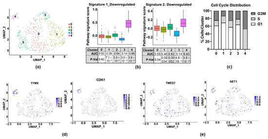 On the basis of the heterogeneity of the ER expression, we also decided to analyze invasive cells by using single-cell RNA-sequencing (scRNA-seq). A total of 543 INV+ cells were analyzed and were found to cluster into five subpopulations on the basis of their transcriptomes (Figure 4a). The full differentially expressed gene lists for each cluster are shown in Supplemental Table S5. ER expression was found in 4% of the cells, but below the level of detection when QC cutoffs were applied to the data, which may be due to low expression or to technical issues, such as mRNA degradation after cell lysis, lower capture, variable amplification efficiency, or varied sequencing depth [30]. To assess the ER activity, we used the Hallmark Estrogen Response Early gene set from MsigDB [31,32] and found that it was not enriched in any cluster (data not shown), which supports the idea that classical ER activity is low in invasive cell populations. To examine ICI-regulated gene signatures in INV+ cell populations, we focused only on genes downregulated by ICI. This was because the RNA-seq and qPCR data (not shown) indicate that ICI upregulates (and therefore ER suppresses) some NFκB target genes and EMT-related genes. As EMT is typically associated with increased invasion, it is therefore unlikely that these genes contribute to the ER’s role in promoting invasion. We found a highly significant enrichment of both Signatures 1 and 2 in Cluster 4, and a moderate enrichment in Cluster 2 (Figure 4b). Since Signature 1 was enriched for proliferation-associated genes, we assessed the proliferative status of each cell cluster by using a cell-cycle scoring algorithm [33]. We found that the cells in Cluster 4 were in either the S (53%) or G2/M (47%) phase, suggesting that this invasive cell population is also actively proliferating (Figure 4c). We also visualized the expression of the proliferation-associated genes from Signature 1 (TYMS, CDK1) and confirmed that they were largely localized to Cluster 4 (Figure 4d). In contrast, the expression of the top genes from Signature 2 (TMED7 and NET1) appeared to be more broadly expressed, and primarily in Clusters 2 and 4 (Figure 4e). To determine how overlapping genes between Signatures 1 and 2 contribute to each signature, an analysis was run with the overlapping genes removed (Supplemental Figure S1). Our findings suggest, as expected, that the overlapping genes made no difference in the enrichment of Signature 1 in Cluster 4, as these genes are not involved in proliferation. In contrast, the overlapping genes make a strong contribution to the enrichment of Signature 2, and particularly in Cluster 2, which supports the inclusion of these genes in Signature 2, as well as their potential role in invasion. Taken together, these findings suggest that ERs may play unique roles in the subpopulations of cells to promote either proliferation or invasion.