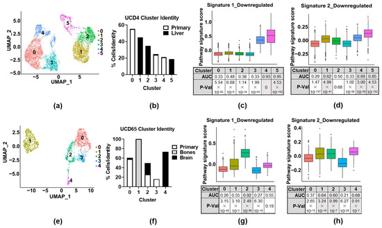 Invasive signatures are enriched in primary and metastatic PDX tumor cell populations. (a,e) UMAP plot showing bi-dimensional representation of single-cell transcriptomes of the PDX-derived breast cancer cell lines: (a) UCD4 and (e) UCD65, representing primary tumors and tumors in various sites of metastasis. (b,f) The contributions of each cell’s identity (i.e., primary or metastatic tumor) to each cluster (% of total number of cells in original identity) in each dataset. (c,d). Box plot and FEA for Signatures 1 and 2 in the UCD4 dataset. (g,h). Box plot and FEA for Signatures 1 and 2 in the UCD65 dataset.