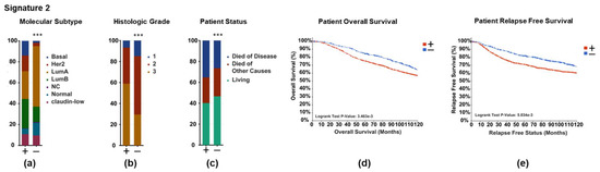 Invasive Signature 2 is associated with poor outcome in ER+ breast cancer patients. cBioPortal for Cancer Genomics was used to query 1904 patients with breast tumors from the METABRIC cohort for genes downregulated by ICI in Signature 2. Patients were stratified on the basis of high expression (+ = mRNA expression 3 standard deviations above the mean) or low expression (− = mRNA expression below 3 standard deviations below the mean) of genes downregulated by ICI from Signature 2, normalized to the reference population, where each gene is compared to the mean level of expression of all samples in the cohort. The distributions of the (a) molecular subtype, (b) histologic grade, (c) patient status, (d) patient overall survival, (e) and relapse-free survival between (+) and (−) groups are displayed. Statistical significance was determined using (a–c) chi-squared test or (d) log-rank test. *** p < 0.01.