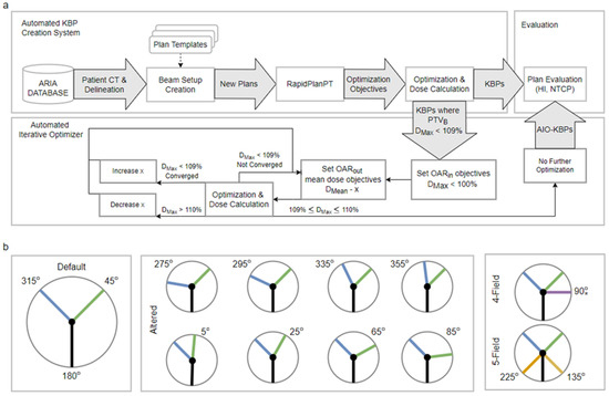 In summary, in this study, we use a previously introduced automated knowledge-based planning solution and a previously validated RapidPlanPT model to generate KBPs with both default and altered beam angle arrangements without human interaction [12]. We demonstrate the AIO process and evaluate the default and altered beam arrangement KBPs both before and after AIO in terms of NTCP and the PTV homogeneity index (HI).