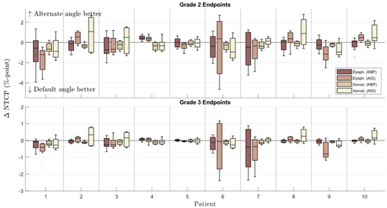 The KBPs with altered beam angles produced by the automated knowledge-based planning solution, before AIO was applied, had on average slightly worse NTCP metrics and a slightly better homogeneity index (Figure 2 and Figure 3). The patient-specific grade 2 dysphagia and xerostomia were lowest for the default beam angle arrangement in 42 and 61 out of 80 cases (10 patients, each with 8 altered beam angles), respectively. The respective mean differences were 0.3 ± 1.0 and 0.3 ± 0.4% in favor of default-angle KBPs, where only the latter was statistically significant. Both grade 2 dysphagia and xerostomia were reduced the most for patient seven, with respective reductions of 1.2 and 0.3% in two separate KBPs with beams at 25° and 85°. There were no statistically significant differences in NTCPΣ, HI, or CI between default- and altered-angle KBPs, and the altered-angle plans showed at most <1% reduction in NTCPΣ. However, there were 13 altered-angle plans with HI reduction >1.
