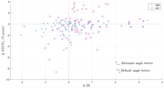 Difference in the sum of grade 2 NTCP endpoints and HI between KBPs with default and alternate beam angles (default minus altered). ∆NTCPΣ = difference in the sum of grade 2 normal tissue complication probabilities; KBP = knowledge-based plan; AIO = automatic iterative optimizer-generated plan.