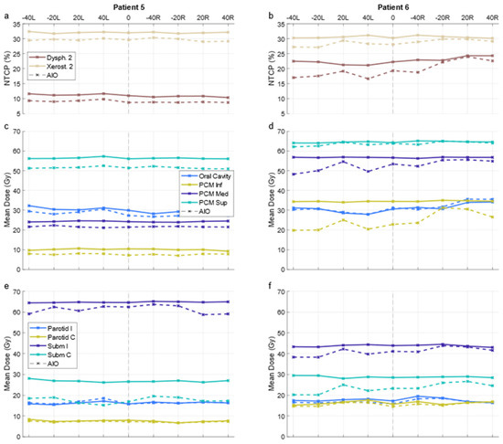 NTCPs (a,b) and OAR mean doses (c–f) over all plans for two patients. Solid and dashed lines indicate KBP and AIO plans, respectively. X-axis indicates the angular deflection of one of the fields; “0” corresponds to the default arrangement and “−40R” to the plan where the right field (in patient coordinates) is deflected by −40 degrees. PCM Inf/Med/Sup = inferior/middle/superior pharyngeal constrictor muscle; Parotid I/C = ipsi-/contralateral parotid gland; Subm I/C = ipsi-/contralateral submandibular gland; KBP = knowledge-based plan; AIO = automatic iterative optimizer-generated plan.