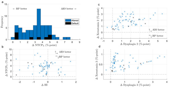 Difference in NTCPΣ (a), NTCPΣ and HI (b), and individual NTCP grade 2 and 3 endpoints (c,d) between RP- and AIO-produced KBPs (RP minus AIO). The upper right quadrant of scatter plots indicates that both endpoints are superior in AIO plans. RP = Rapid Plan-generated plan; AIO = automatic iterative optimizer-generated plan; ∆NTCPΣ = difference in the sum of grade 2 normal tissue complication probabilities.