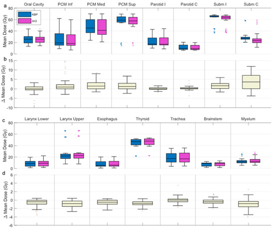 None of the OAR were systematically reduced in any of the AIO plans, but were instead increased by <1 Gy in about 25% of cases. None of the OAR (NTCP-related or otherwise) saw mean dose increases over 5 Gy, apart from the oral cavity, the mean dose for which was increased by over 5 Gy in two cases (Figure 6c,d).