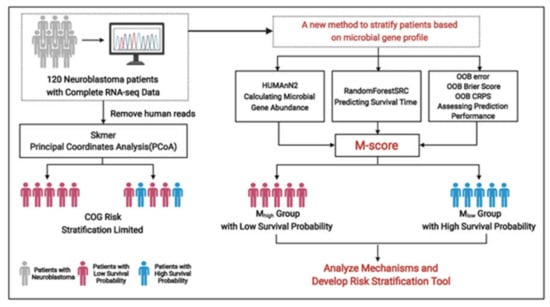 Meanwhile, the predicted values of our developed model were used to define an M-score consisting of 9063 microbial genes of interest. Higher values (Mhigh) indicated a higher risk of dying from neuroblastoma and a shorter survival time. We stratified high-risk COG patients into high- and low-risk groups based on the M-score.