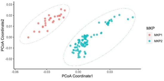 After removing reads that could be mapped to the human genome, we performed pattern analysis on the non-human reads, mainly from the microbiome. Skmer [17] extracted k-mer (k = 32) patterns from the non-human sequence for each sample. We named those microbiome patterns Microbiome K-mers Profile (MKP). PCoA [18] took the dissimilarity matrix of MKP computed by Skmer as input to cluster patients by MKP similarity. It showed that the 120 patients were grouped into two MKP clusters, MKP1 and MKP2 (Figure 2). Cox proportional hazards regression analysis (Table 2) showed that the survival times of the patients in these two clusters are significantly different (p = 9.505 × 10−8). Additionally, it suggested that MKI and COG risk are particularly associated with the patient’s survival time (p = 0.05555, p = 2.659 × 10−5, respectively), while other factors are not statistically significantly associated with the two clusters in our study (Table 2). Notably, MKP is associated with patient survival time with higher significance than all other factors.