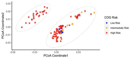Principal coordinate analysis of the gene dissimilarity matrix computed by Skmer (COG Risk). One of the microbiome clusters, MKP2, contained patients defined by COG criteria as high, medium, and low risk. The COG high-risk patients had distinct microbiome characteristics. Some COG high-risk patients in MKP2 had similar microbiome features to those with COG medium and low risk. Red, orange, and blue points represent patients categorized by COG criteria as high, intermediate, and low risk. Remarkably, all patients clustered in MKP1 were COG high-risk; however, MKP2 contained patients in all three different COG risk levels.