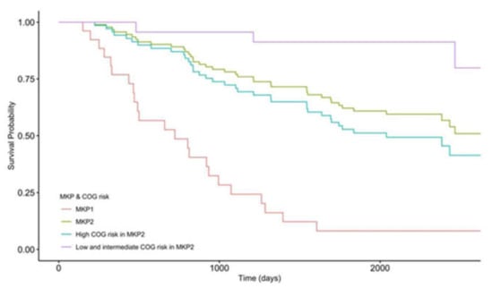 Kaplan-Meier estimator within four different MKP and COG risk groups. The COG high-risk patients in MKP1 and MKP2 had lower survival probabilities than COG low and intermediate-risk patients in MKP2. The hazard ratio (HR) for death among high-risk patients in MKP1 was 17.1 times that of patients with low and intermediate COG risk in MKP2 (p = 4.605 × 10−9). The HR for death among high-risk patients in MKP2 was 5.56 times that of patients with low and intermediate-risk in MKP2 (p = 0.0004). However, the survival probability of high-risk patients in MKP1 was lower than that of patients with high risk in MKP2. The HR for death among high-risk patients in MKP1 was 3.78 times that of those in MKP2 (p = 6.422 × 10−6). Additionally, the total survival probability for patients in MKP1 was lower than those in MKP2. The HR for death in MKP1 was 5 times that in MKP2 (p = 9.505 × 10−8).