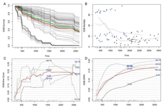 Performance measures for the MKP model. (A) The estimated survival function for each individual. The thick red line represents overall ensemble survival, and the thick green line represents the Nelson–Aalen estimator. (B) The plot of survival probabilities is estimated for each patient based on our prediction model in the OOB ensemble (points in blue correspond to death events; black points are censored observations). (C) OOB time-dependent Brier Score (0 = perfect, 1 = poor, and 0.25 = guessing). The score is shown stratified by ensemble mortality into four groups corresponding to the 0–25, 25–50, 50–75, and 75–100 percentile values of mortality. The red line is the overall (non-stratified) time-dependent Brier score. (D) OOB time-dependent CRPS (0 = perfect, 1 = poor, and 0.25 = guessing). The score is shown stratified by ensemble mortality into four groups corresponding to the 0–25, 25–50, 50–75, and 75–100 percentile values of mortality. The red line is the overall (non-stratified) time-dependent CRPS.