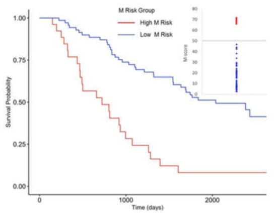 As mentioned above, we found that high COG risk patients could be stratified into smaller subsets with different survival probabilities according to their various microbial gene abundances. We defined our microbiome prediction score as M-score, applying our prediction model’s predicted values. Higher M-score, Mhigh, means a higher risk for patients dying from neuroblastoma within a specific period. Additionally, the result showed that the distributions of M-scores of high COG risk patients in the training dataset are clustered into two separated groups. The result from Cox regression for survival analysis demonstrated that patients in Mhigh had a higher clinical risk (shorter survival time) than those in Mlow (p-Value = 0.0016). Thus, we set 50 as a threshold of M-score to further classify high COG risk patients into Mhigh or Mlow risk levels. Patients with M-scores higher than 50 were classified as Mhigh, and those with M-scores lower than 50 were classified as Mlow. Next, we tested the accuracy of the M-score in our validation dataset (Figure 6). Figure 6 indicates that M-score could stratify patients into two M risk groups, in which the survival times of patients were significantly different (p-Value = 0.0018). According to the above analysis, the microbiome prediction score based on the M-score can better predict the survival probability of neuroblastoma patients than the current COG method. Cox regression for survival analysis of the training dataset demonstrated that patients in Mhigh had a higher risk of death than those in Mlow (p-Value = 0.0016).