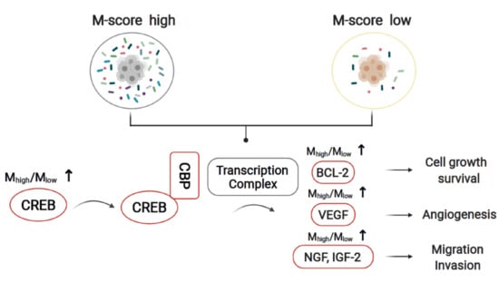 CREB activation may be a key genetic event related to M-score that contributes to the tumorigenesis in the Mhigh group with low-survival probability. Among the 120 patients, the CREB was over activated in the Mhigh group relative to the Mlow group. This could be responsible for activating downstream genes related to cell growth, survival, angiogenesis, migration, and invasion, including BCL-2, VEGF, NGF, and IGF-2, thus leading to the lower survival probability in the Mhigh group.