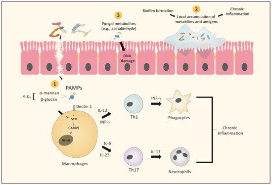 Inflammation is widely believed to contribute to cancer development and progression, as indicated by higher cancer incidence among individuals with various chronic inflammatory disorders, such as IBD, ulcerative colitis, pancreatitis, and chronic atrophic gastritis [34]. Several studies have focused on the heightened immune response following fungal infection [35]. During fungal invasion, pattern recognition receptors (PRRs) identify pathogen-associated molecular patterns (PAMPs) comprised of the carbohydrate components of the fungal cell wall. Pattern recognition receptor binding of PAMPs initiates signaling cascades through several pathways. These pathways include Toll/IL-1R domain-containing adaptor-inducing IFN-β (TRIF), spleen tyrosine kinase—caspase recruitment domain 9 (SYK-CARD9), and myeloid differentiation primary response gene 88 (MYD88). Initiation of these pathways results in the synthesis of various signaling molecules, including interleukin 1β (IL-1β), IL-6, IL-12, IL-23, transforming growth factor-β (TGF-β), and interferon -γ (IFN-γ), which orchestrate the antifungal response mediated by Th1 and Th17 cells, in coordination with phagocyte activation and neutrophil recruitment [36]. (Figure 1).