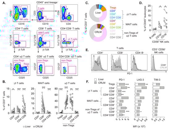 A plethora of immune cell subsets exist in the liver, and CRLMs are likely infiltrated by leukocytes from the blood and surrounding liver tissue. We determined the frequencies of immune cells in CRLM and adjacent macroscopically tumor-free liver tissue from patients with synchronous or metachronous CRC (Supplementary Table S1). Multiple lymphocyte subsets were defined (Figure 1A), including unconventional γδ T cells and mucosal-associated invariant T cells (MAIT cells). These unconventional T cells are normally involved in anti-microbial responses but have also been associated with pro- or anti-tumor responses [24,25,26]. The expression of the γδ T cell receptor (TcR) and Vα7.2 TcR defined γδ T cells and MAIT cells, respectively. Whereas γδ T cells were mainly within CD4−CD8− T cells, MAIT cells were observed predominantly among CD8 T cells.