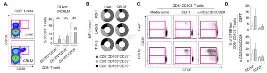 Since CD103+CD8+ TRM cells in primary CRC correlated with a favorable prognosis [16], and CD103+CD39+CD8+ TILs have been described as tumor-reactive in various solid tumors [11,12], we assessed T cells by detecting these markers. CD103+CD8+ TRM cells were more abundant in CRLM relative to the adjacent liver (Figure 2A). Interestingly, CD103+CD39+CD8+ TRM cells were predominantly found in CRLM.
