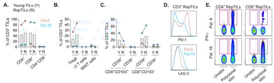 Whereas young-TILs refer to TILs expanded as they emigrate from pieces of CRLM, RepTILs consist of young-TILs that were further expanded prior to adoptive transfer. Although frequencies of CD4+ or CD8+ TILs were quite similar between young-TILs and RepTILs, the ratios of these subsets in the respective patients were in stark contrast (Figure 3A). Expanded TILs from patient 8 with a higher frequency of CD4+ TILs also contained more Tregs (Figure 3B). Interestingly, unconventional TILs were not expanded. Regarding TRM cells, expanded TILs from patient 16 that comprised more CD8+ TILs also contained more CD8+CD103+ TRM cells (Figure 3C). The RepTILs from the two patients also expressed contrasting levels of PD-1 and LAG-3 (Figure 3D). Importantly, RepTILs showed a general ability to mount effector responses, as they readily produced IFN-γ upon polyclonal stimulation (Figure 3E).