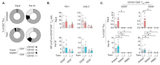 The CD103+CD39+CD8+ TRM cells in tumor implants tended to have higher PD-1 and LAG-3 expression than CD103+CD39−CD8+ TRM cells (Figure 4B), suggesting the possibility of distinguishing the activation state of TRM cells via CD39 expression.