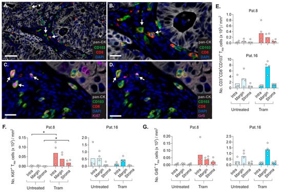 Trametinib promotes increased density of CD8+ TRM cells at specific sites of tumor implant. Tissue staining of CD3+CD103+CD8+ TRM cells and the expression of Ki67 (proliferation marker) and Granzyme B (GrB, involved in T-cell-mediated killing of target cells) in tumor implants of patients 8 and 16. PDX mice were treated as described in Figure 4. (A) Pan-cytokeratin (pan-CK)+ tumor epithelia and pan-CK- tumor stroma contained CD3+ TILs with variable CD8 and CD103 expression. Individual cells are defined by DAPI+ cell nuclei. Arrows denote CD8+CD103+ TRM cells in stromal and intraepithelial tumor compartments. The arrows indicate TRM cells (B) and examples of CD8+ TRM cells expressing Ki67 (C) or GrB (D). (E) Density of CD8+CD103+ TRM cells within tumor epithelia (intra) and at the tumor margin (0–49 μm away from tumor bed) or stroma (50–100 μm away from tumor bed). Density of CD8+CD103+ TRM cells expressing Ki67 (F) or GrB (G). Scale bars: 50 μm in A, and 20 μm in B-D. (* p < 0.05, Mann–Whitney test).