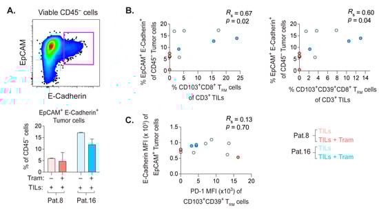 A large variety of human tumors express E-Cadherin (CD103 ligand) [28]. Binding of E-cadherin on PDX tumor cells to CD103+ CD8+ TRM cells may sequester these TILs within the tumor implant, and the expression of E-Cadherin by EpCAM+ tumor cells was not affected by trametinib treatment (Figure 6A). Interestingly, the frequency of E-cadherin+ tumor cells correlated with the percentage of CD8+ TRM cells co-expressing CD39, or not (Figure 6B). However, there was no link between the expression levels of E-Cadherin vs. PD-1 on CD103+CD39+CD8+ TRM cells (Figure 6C).